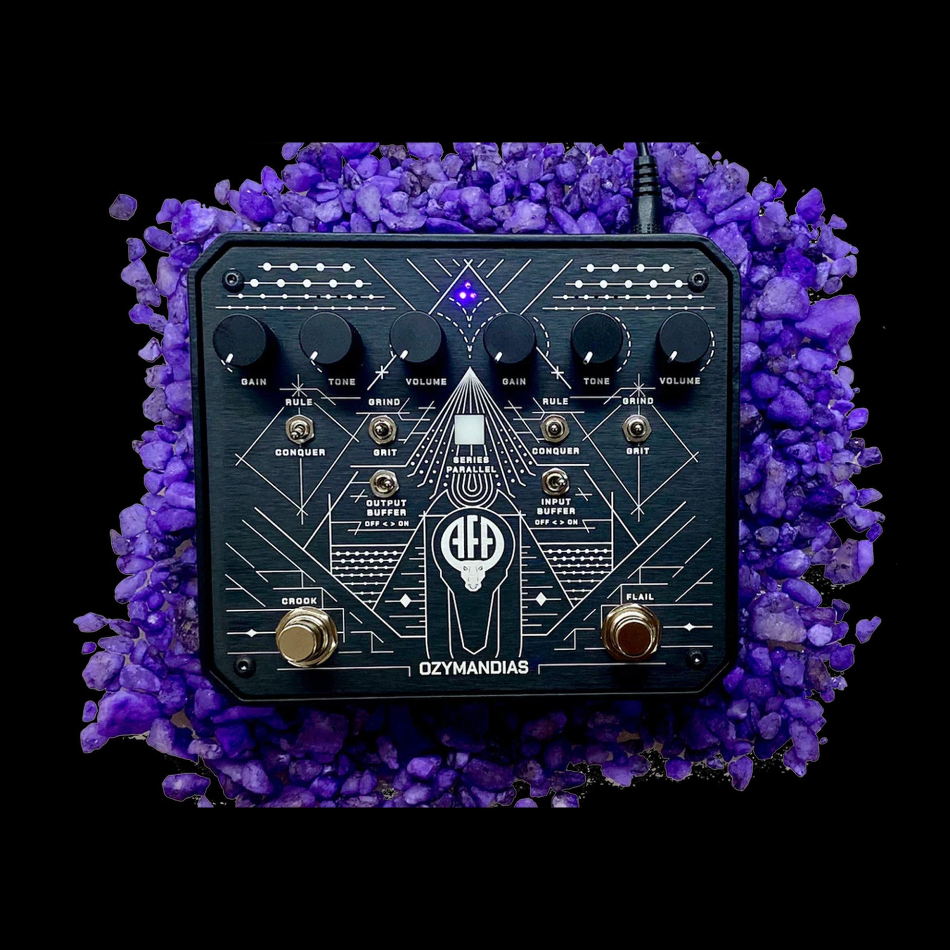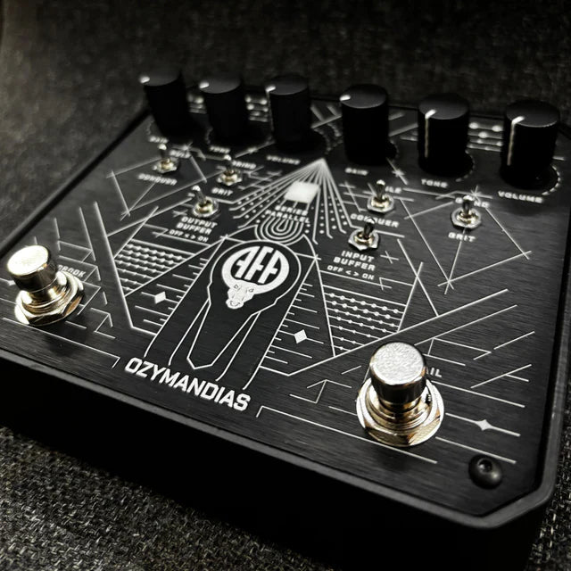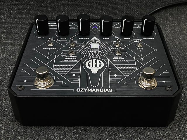 Ozymandias is a stacked dual-overdrive/distortion pedal that offers a plethora of usage options, choices fit for the King of Kings. From a near-clean boost with unparalleled headroom to full bore bourbon-swilling crunch, this one rules them all.