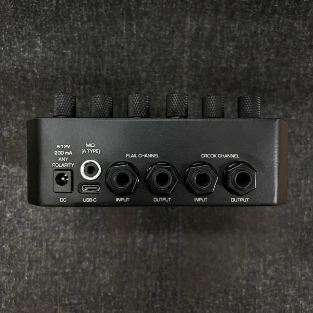 The CROOK channel (left side, blue LED) boasts a full, fat thick sound and amp-like voicing. This channel is more articulate, grainy and has a huge low end.
