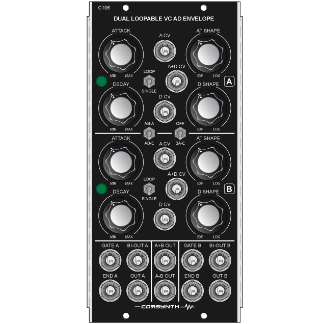 The Corsynth C106 Dual Loopable VC AD Envelope & more it’s a really versatile module. It’s not only a Dual Voltage Controlled Attack / Decay envelope, it’s also a dual VC LFO, an audio generator, a complex contour generator, a dual pulse delay, a voltage controlled AD envelope with adjustable delay and more...The core of this module are two loopable voltage controlled Attack / Decay envelopes that can be interconnected in different ways to create different functions.
