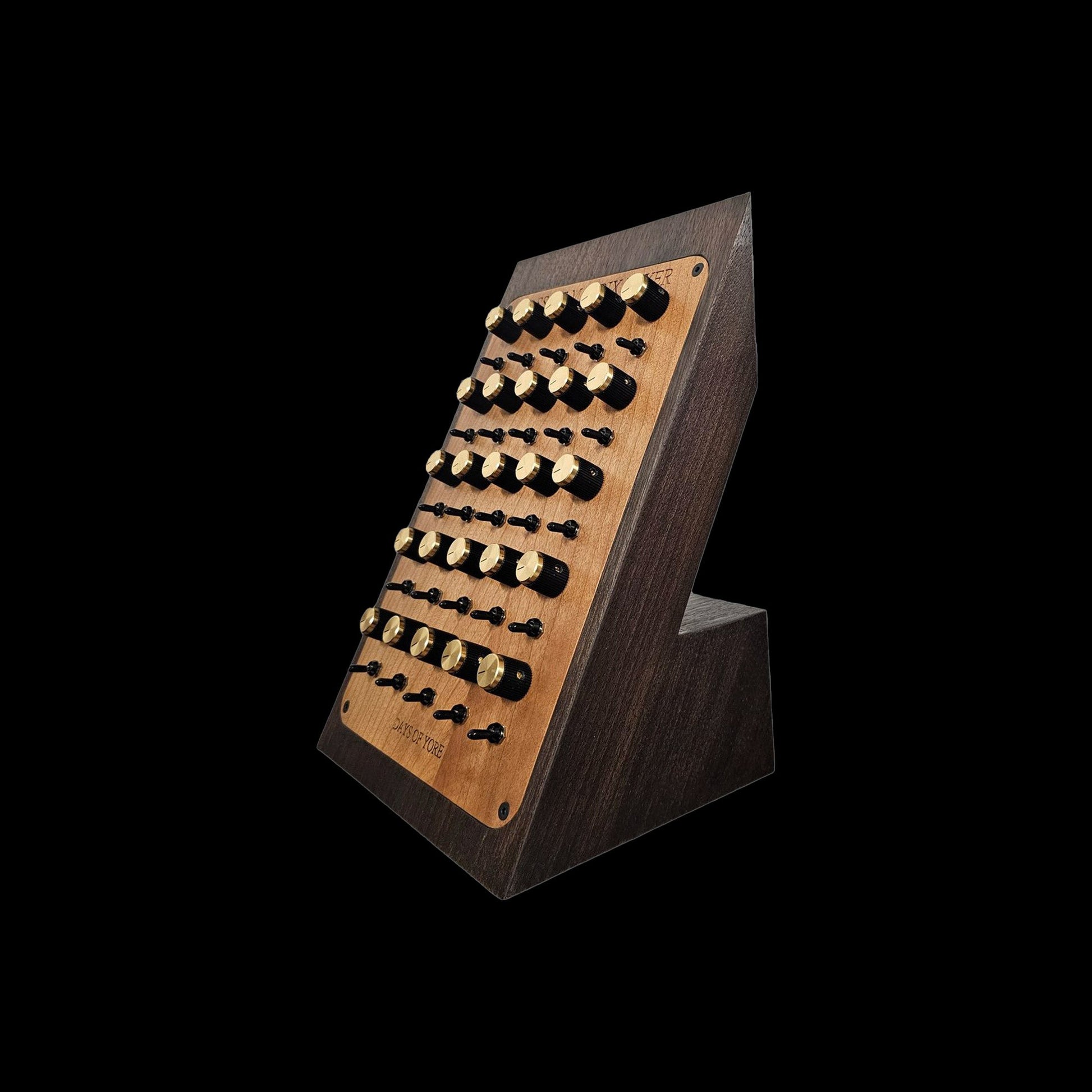 The Days Of Yore Passive Matrix Mixer is a five-input, five-output matrix mixer bringing exquisite craftsmanship and studio-grade audio to all your experimental mixing pursuits. Demanding attention with its unmistakable walnut enclosure and cherry wood top, Days of Yore has created a feedback mangling, audio dispersing beast fit for a King's arsenal of experimental music tools. The passive design requires no power to operate, cleanly passing signals through a complex routing arrangement with uncolored audio for complete control of your tone. Each matrix volume pot features an on/off switch, facilitating a cleaner mix when a particular node is not in use, or supplying 25 performative switches for quickly changing signal routing and feedback behavior.