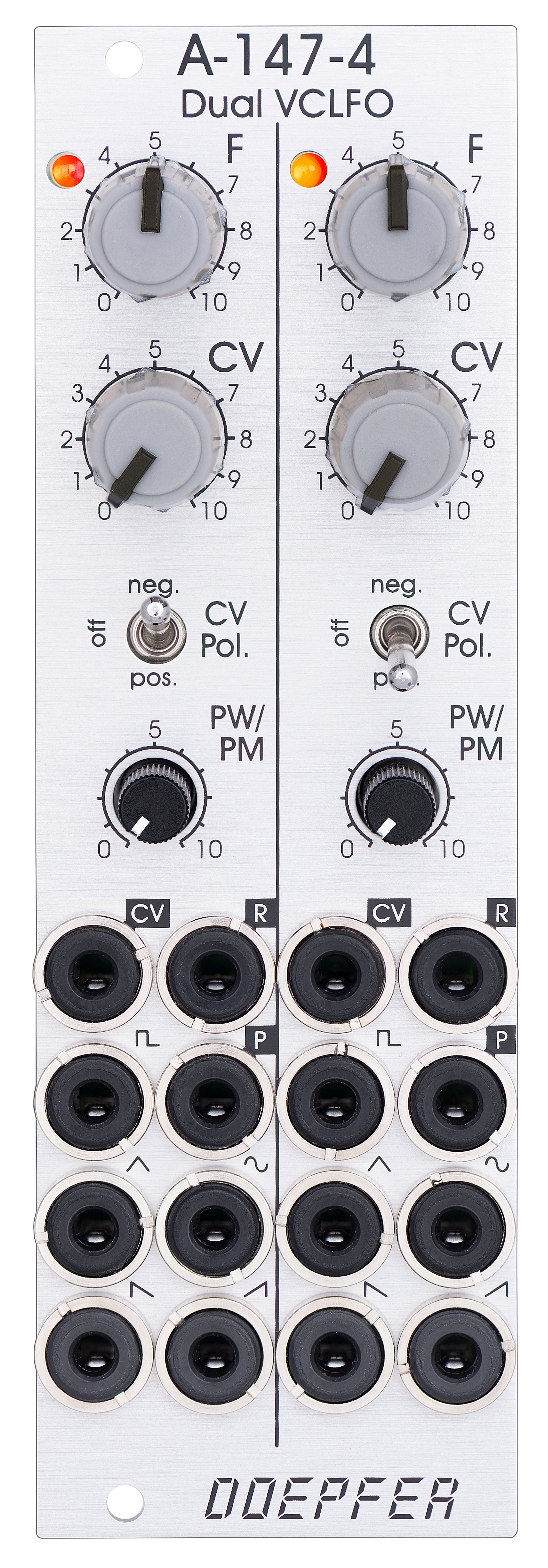 Module A-147-4 is a dual voltage controlled LFO (Low Frequency Oscillator). Each LFO has the five waveforms triangle, sine, rising and falling sawtooth, as well as rectangle available. The rectangle output features manually adjustable pulsewidth and pulsewidth modulation by means of an external control voltage. The core waveform is triangle. The other waveforms are derived from triangle by means of waveform converters. The frequency of each LFO can be adjusted manually and modulated by means of an external control voltage with associated attenuator and polarity switch. By means of a jumper the basic frequency range of each LFO can selected: about 0.02 Hz (~ 50 seconds) ... 2.5kHz or about 0.0017 Hz(~ 600 seconds) ... 220Hz. That way each LFO can be used also as a VCO with a max. frequency of about 2.5kHz. Each LFO features a reset input which can be used to reset the triangle signal.