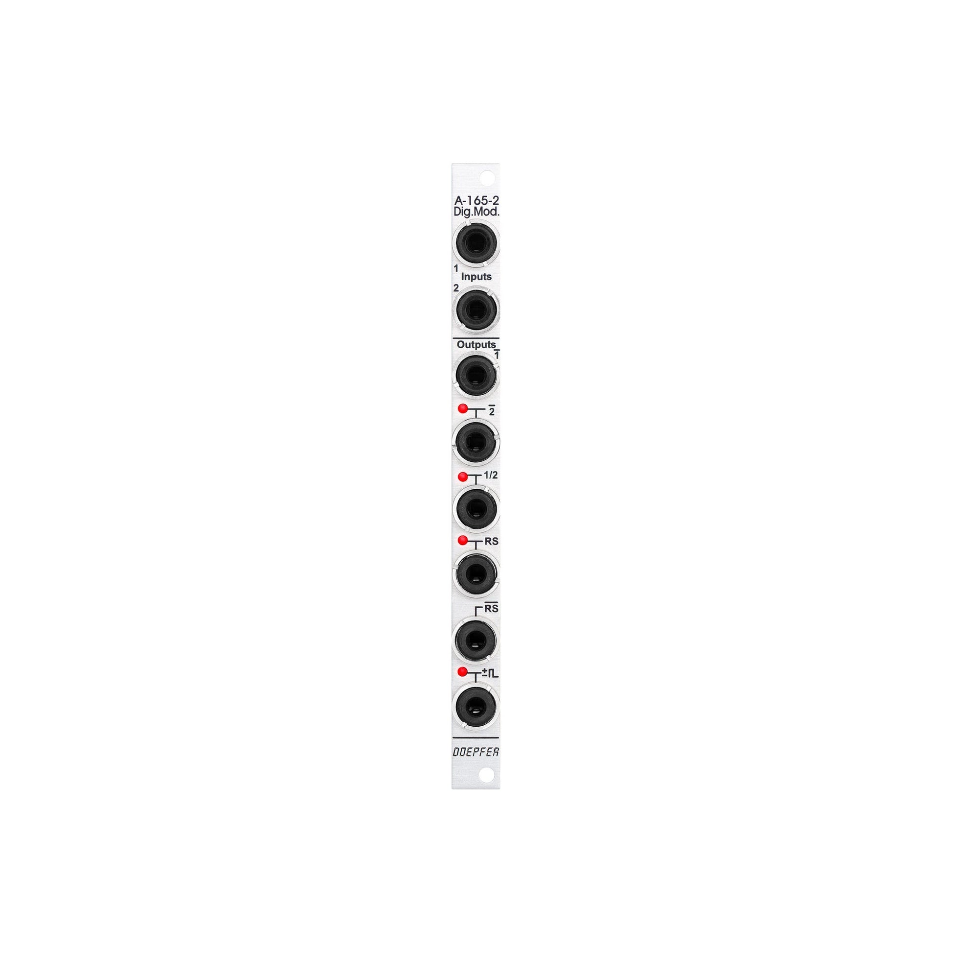 Doepfer's A-165-2 Digital Modifiers is a straightforward boolean utility module for Eurorack synthesizers. Any signal patched in will be converted to a boolean gate—that is, on or off. A variety of outputs are available to coax interesting trigger and gate signals out of your rig. In addition to standard inverse and toggle flip flop outputs, there's also a Set/Reset flip flop that utilizes both inputs: channel 1 sets the state high, while channel 2 sets it low. There's also an inverse output for this circuit, as well as a delta-based trigger output, generating a 50ms trigger on every low-high or high-low transistion at input 1. Surely a fun utility for power patchers, the A-165-2 is guaranteed to offer some delightful gate and trigger generation.