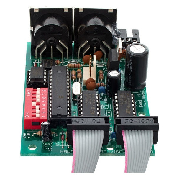 The 16 controlling elements resp. control voltages are connected to two double row pinheaders (10 pins each). To these headers two 10 pin ribbon cables are connected. The controlling elements are connected to the free ends of the ribbon cables. In this way the controlling elements can be pulled off from the electronics.