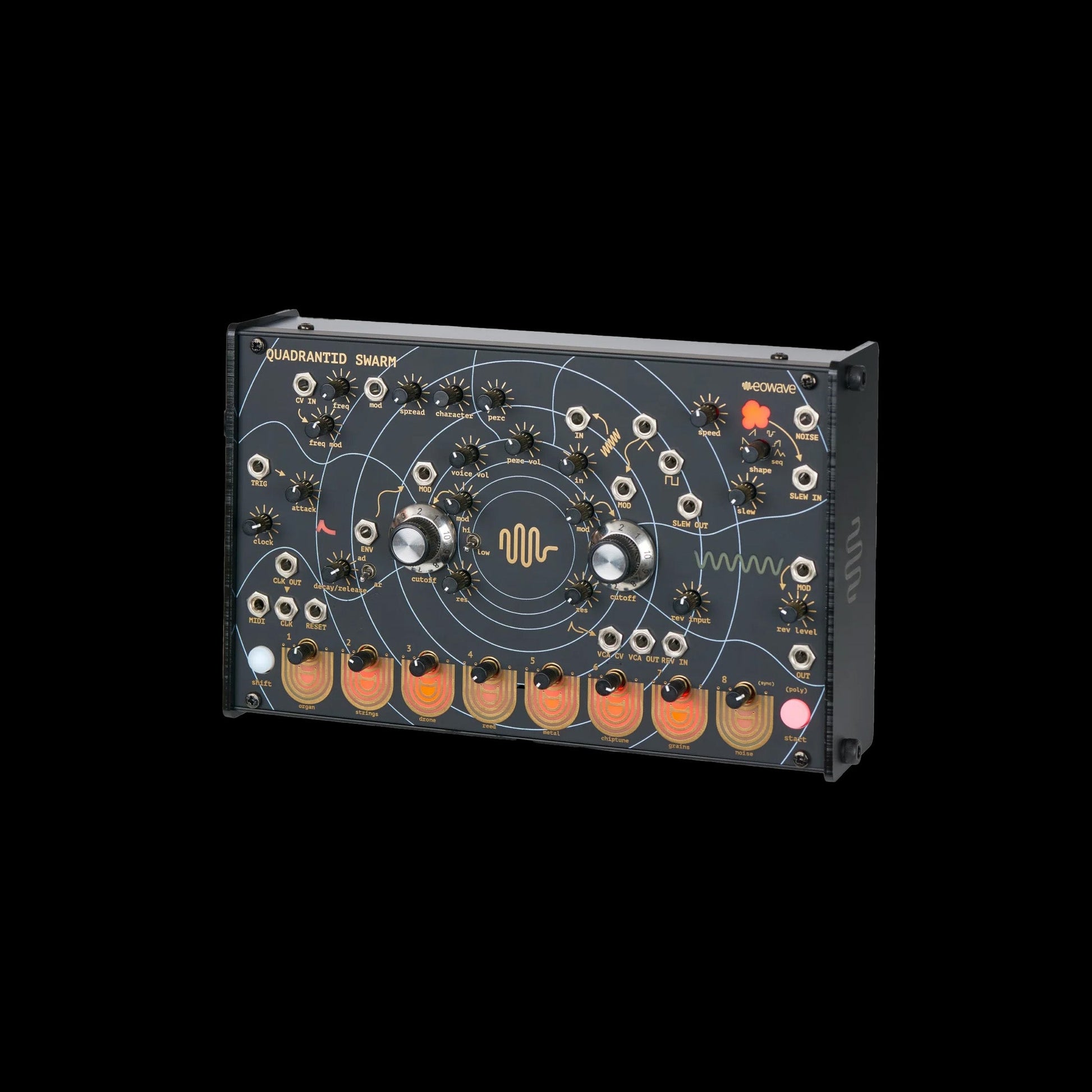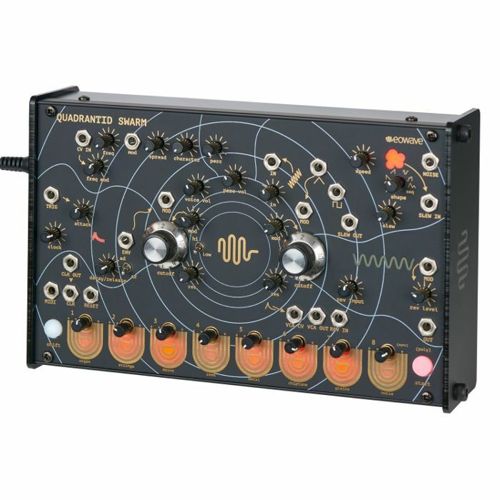 The Quadrantid Swarm is a versatile, unique instrument for sound designers and musicians looking to explore exquisite and unfamiliar timbres that range from subtle to outrageous, nebulous to shimmering. It is comprised of a digital synthesizer voice with a percussive element, 2 pole analogue filter, an LFO with 8 waveforms, and a spring reverb.