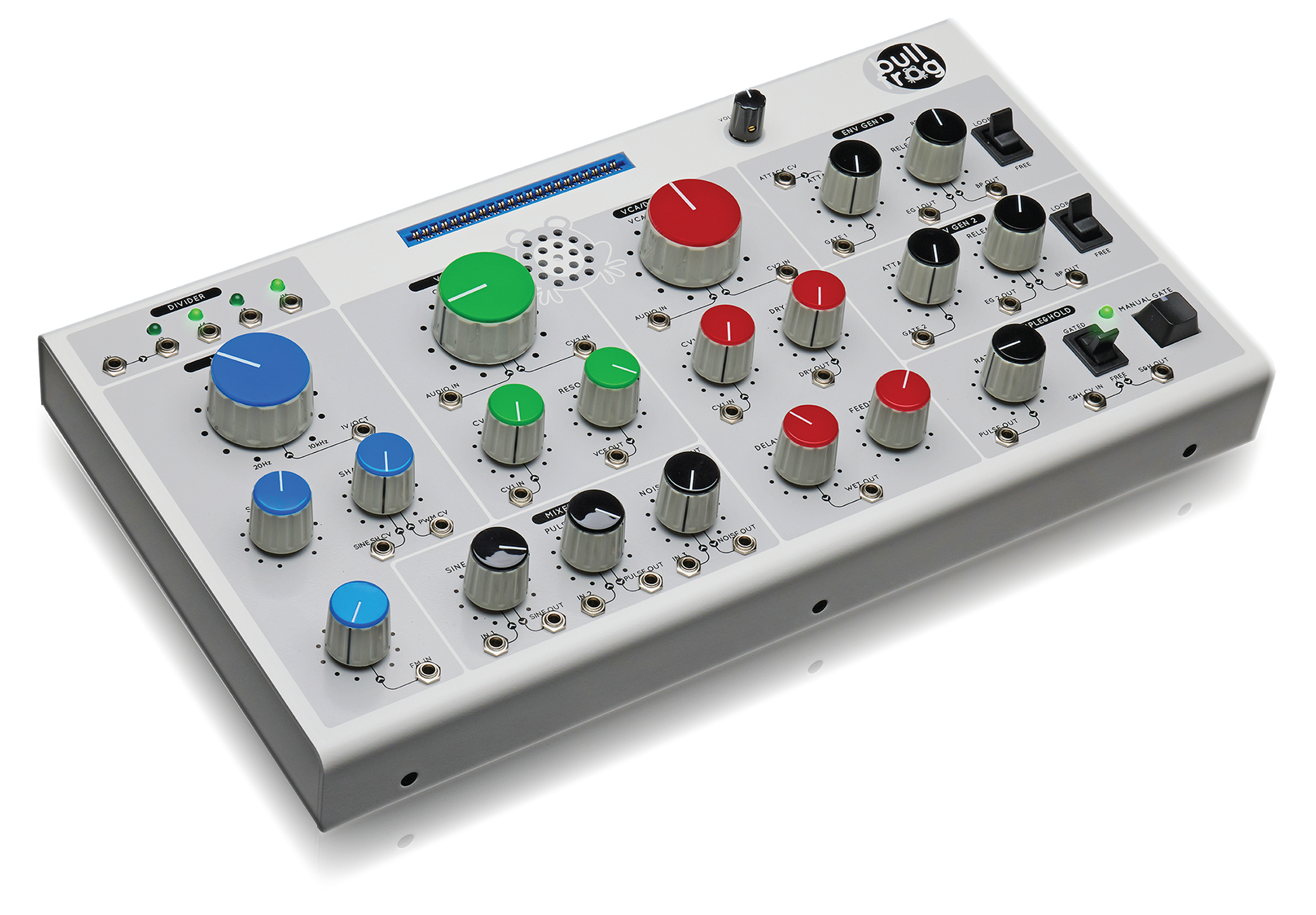 Bullfrog is a classical subtractive synthesizer – it consists of several “modules” for sound generation – VCO, NOISE GENERATOR - and treatment – VCF, VCA/DELAY, as well as “modules” that generate control and modulation signals to control them – ENVELOPE GENERATORS and SAMPLE & HOLD. The Bullfrog will not make the sound on its own unless it is patched – using eurorack patch cables to interconnect the “modules” or by inserting voice cards that create internal connections between the “modules” in a specific way and add extra functionality, like sampler/looper, sequencer, groovebox, etc. This approach better helps to understand the functionality of a subtractive synthesizer and the principles of sound design with instruments like these.