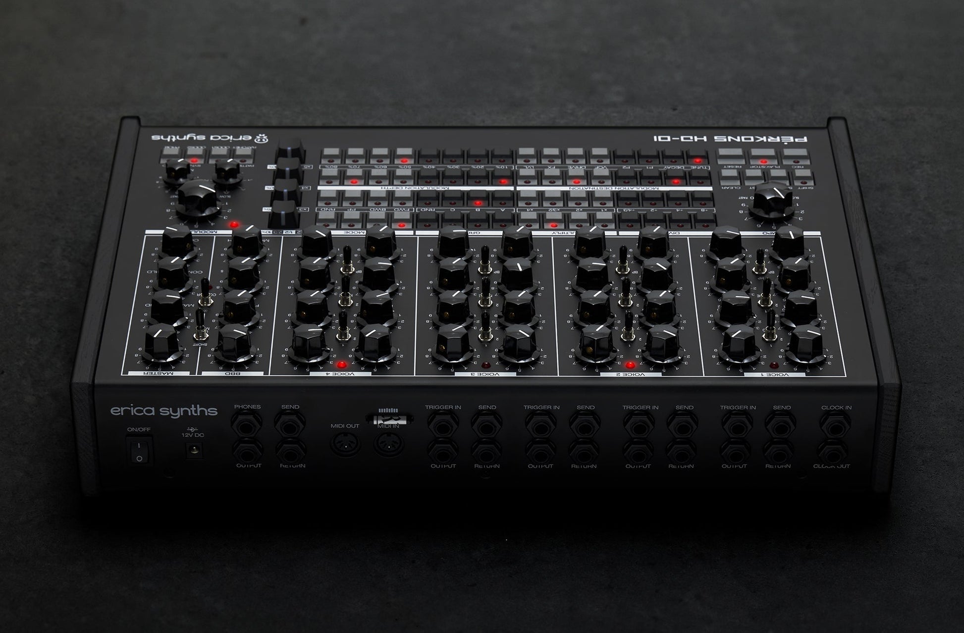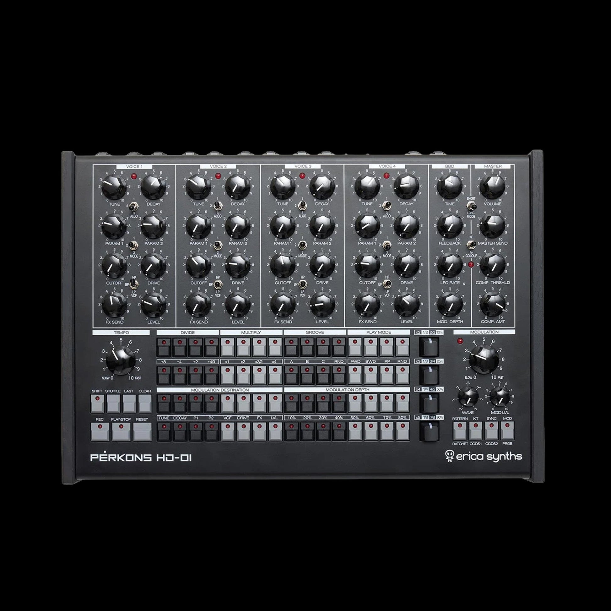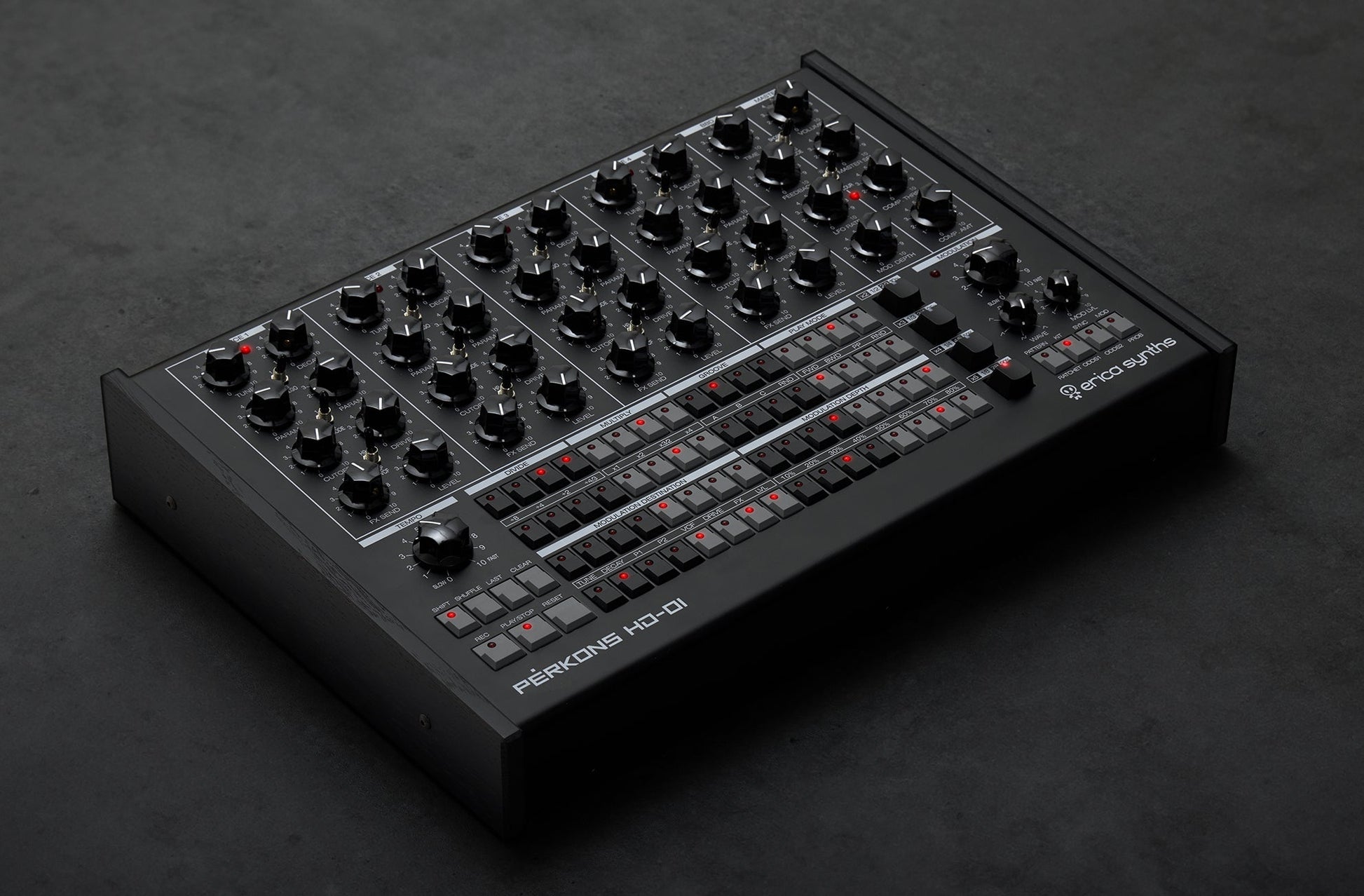 PĒRKONS features four sonically versatile hybrid voices (digital sound engine + analogue multimode filter with overdrive) and a sequencer with simultaneous control over all four percussion tracks.