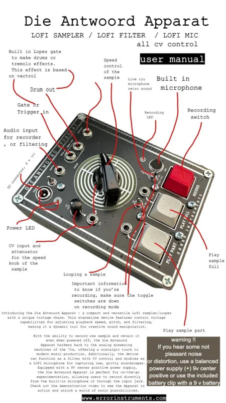 a compact and versatile Lofi sampler/looper with a unique vintage charm. This standalone device features control voltage capabilities for adjusting playback speed, pitch, and filtering, making it a dynamic tool for creative sound manipulation. With the ability to record one sample and retain it even when powered off, the Die Antwoord Apparat harkens back to the analog answering machines of the 70s, offering a nostalgic touch to modern music production. Additionally, the device can function as a filter with CV control and doubles as a LOFI microphone for capturing raw, gritty soundscapes. Equipped with a 9V center positive power supply, the Die Antwoord Apparat is perfect for on-the-go experimentation, allowing users to record directly from the built-in microphone or through the input jack. Check out the demonstration video to see the Apparat in action and unlock a world of sonic possibilities.