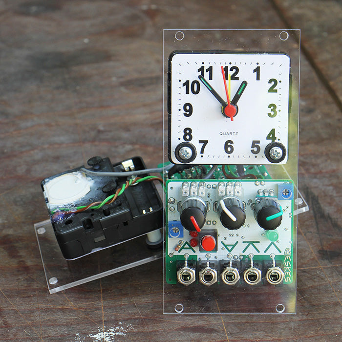 This module is a clock. It can also produce clock sounds thanks to the contact microphone installed behind the panel.