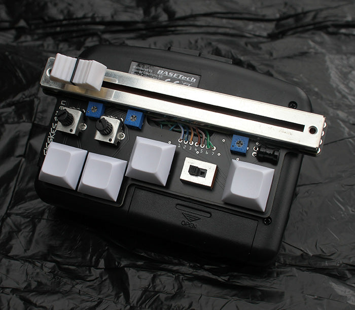 ?Man+ ::ABOUT Simple walkman controller circuit, it can be used to DJ tapes but also to play a tune when you add a tape with just sounds or a pitch of some sound. It can play back sound very slowly, at a very low speed it will start to stutter (meaning stop play stop play and so on). Sometimes the motor can be heard in the the sound. The audio quality is not high, but at low speed the base is still present. All audio is mono. This version has extra features over the first version. I was talking to hainbach about the first version and he gave me some tips to improve, so i thought lets give it a try. It took a while but i managed to get the motor sound in there and a sort of mute feature for the tape player, it was not possible to completely kill the sound without a huge click and this is also nice. I also added a button to mix in the radio. Controls: - 1x Slide potmeter for playback speed. - 1x Push button to Hold or Play the tape. - 1x Slide switch to invert the function of the push button. - 1x Button to cutt off the high frequencies of the tape player sound. - 1x Button with volume pot to mix in the FM Radio that is build into the walkman. - 1x Button with lowpass filter pot to mix in the magnetic fieled of the motor inside the walkman. Power: - 3v DC - 2x AA battery
