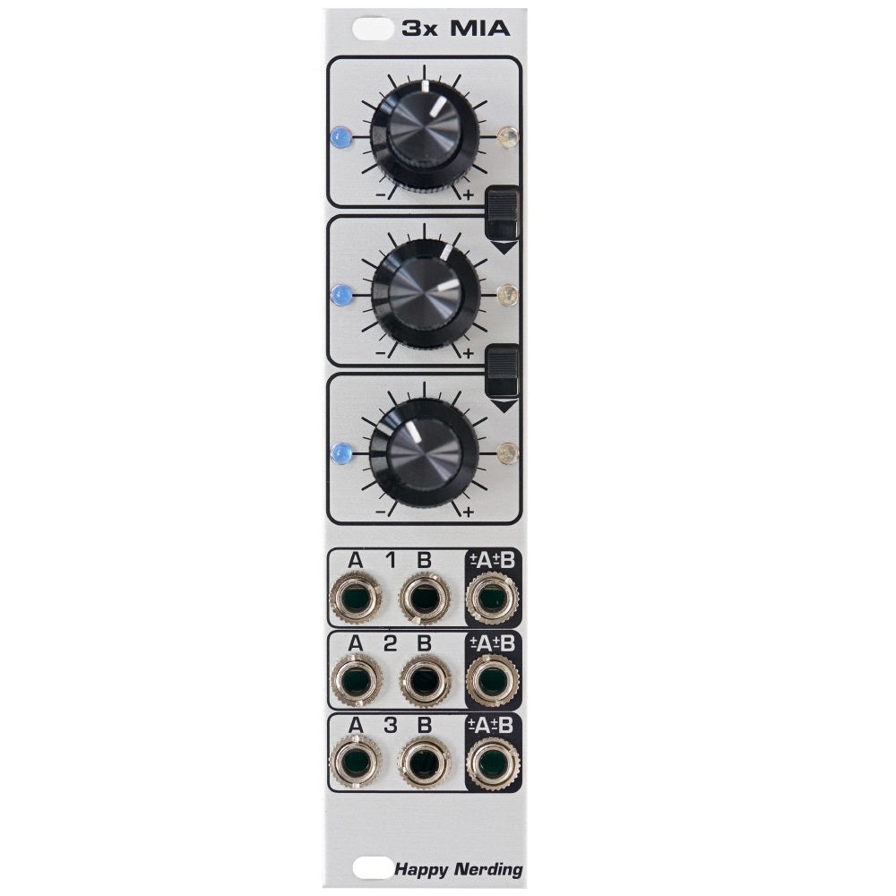 In only six HP Happy Nerding's 3 x MIA module unites three mixers, inverters and attenuator channels, using dual concentric polarizer controls. Each group of two inputs can generate offset voltages, can be utilized as a 2:1 mixer or as an polarizer for scaling signals. Switches sum the group's outputs and expand the mixing functionality by different mix configurations.