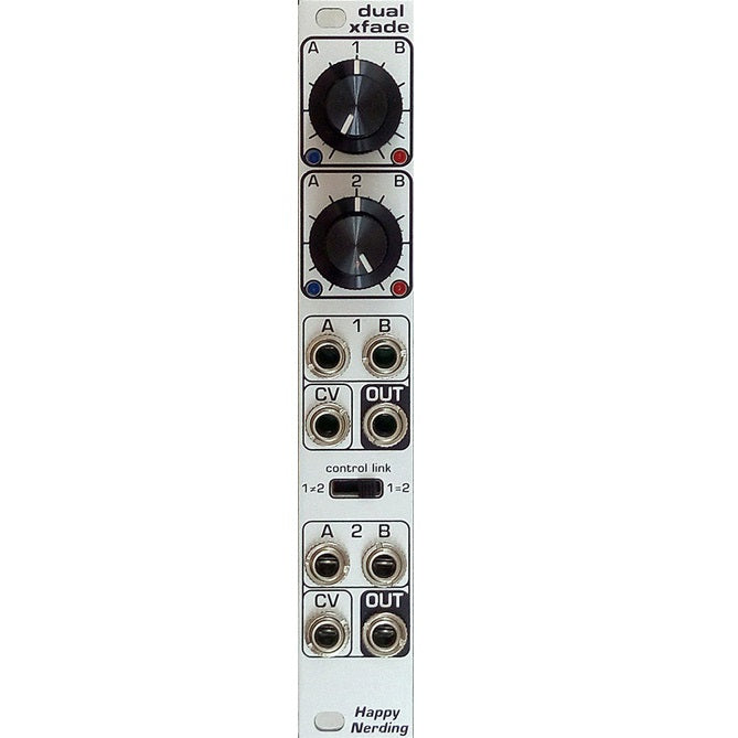 Dual xfade is a compact voltage controlled crossfader suitable for both audio and cvs. Smaller knobs set manual crossfade between a<>b, and bigger knobs are cv attenuverters. Leds show the adjusted positive and negative cv sides for easy monitoring.