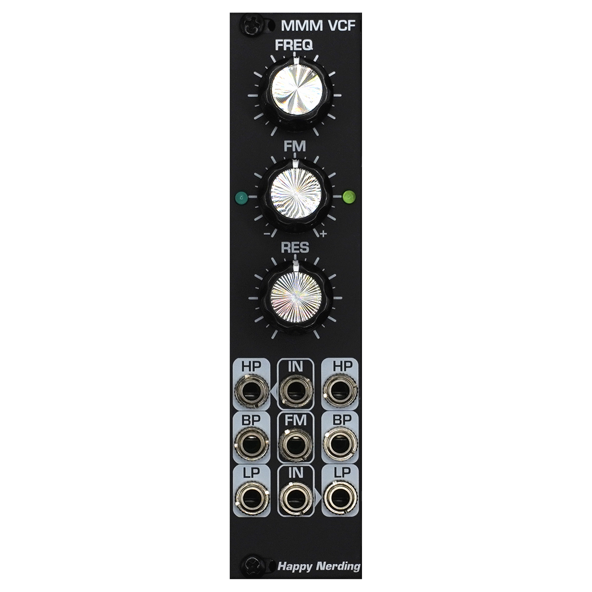 mmm vcmmm vcff (m**g multi mode voltage controlled filter) is a dual vcf having common controls for both parts. thus it can be used as a stereo filter, or patched with different combinations of the available inputs/outputs. and all this functionality is packed in the compact 6 hp wide module. mmm vcf has the famous transistor ladder core introduced by bob moog, but also features the added band pass and low pass modes, not available in the original design. those extra modes are greatly widen the possible spectral modification of the input sound. the module was carefully designed to have vanishingly small noise and bleed.