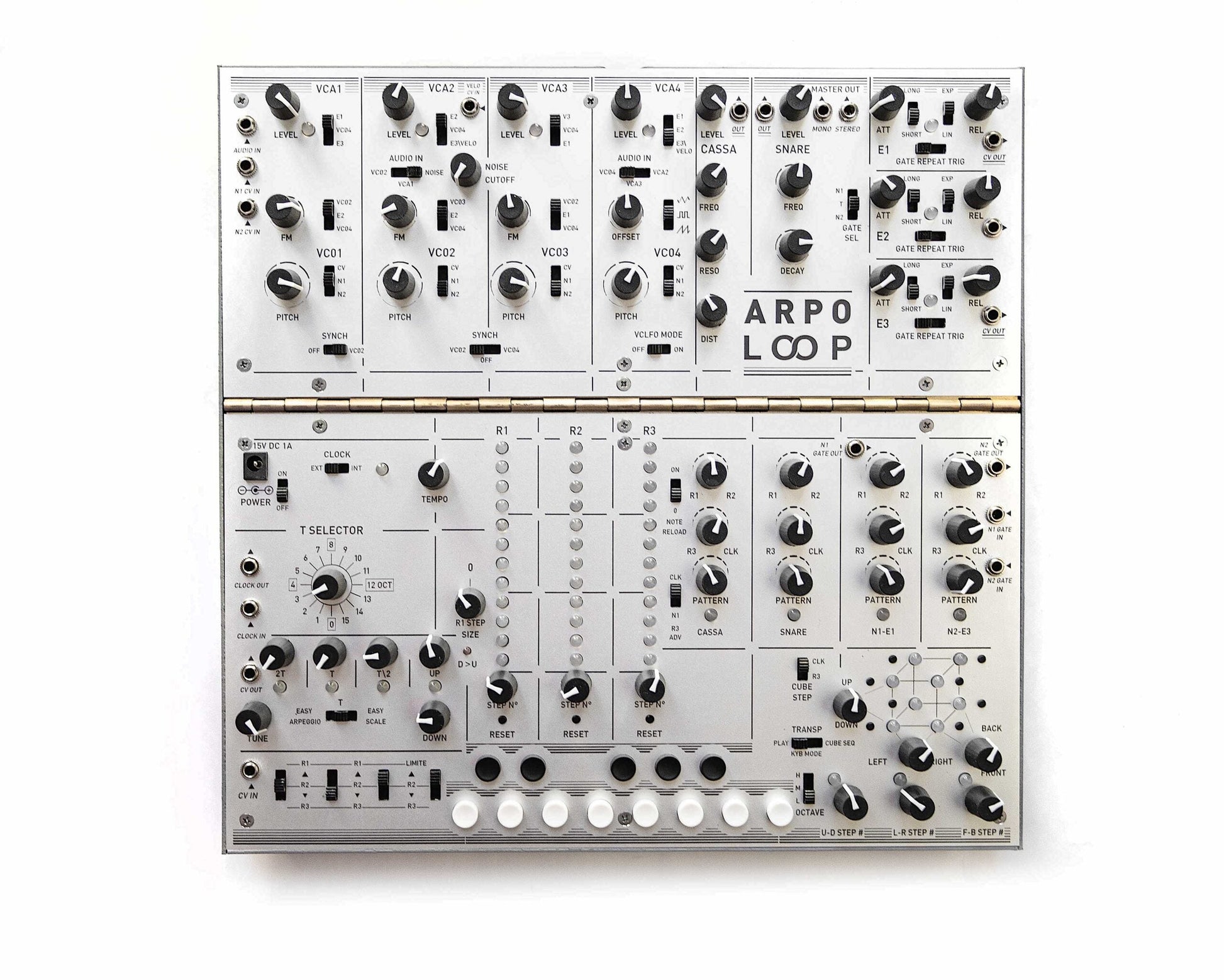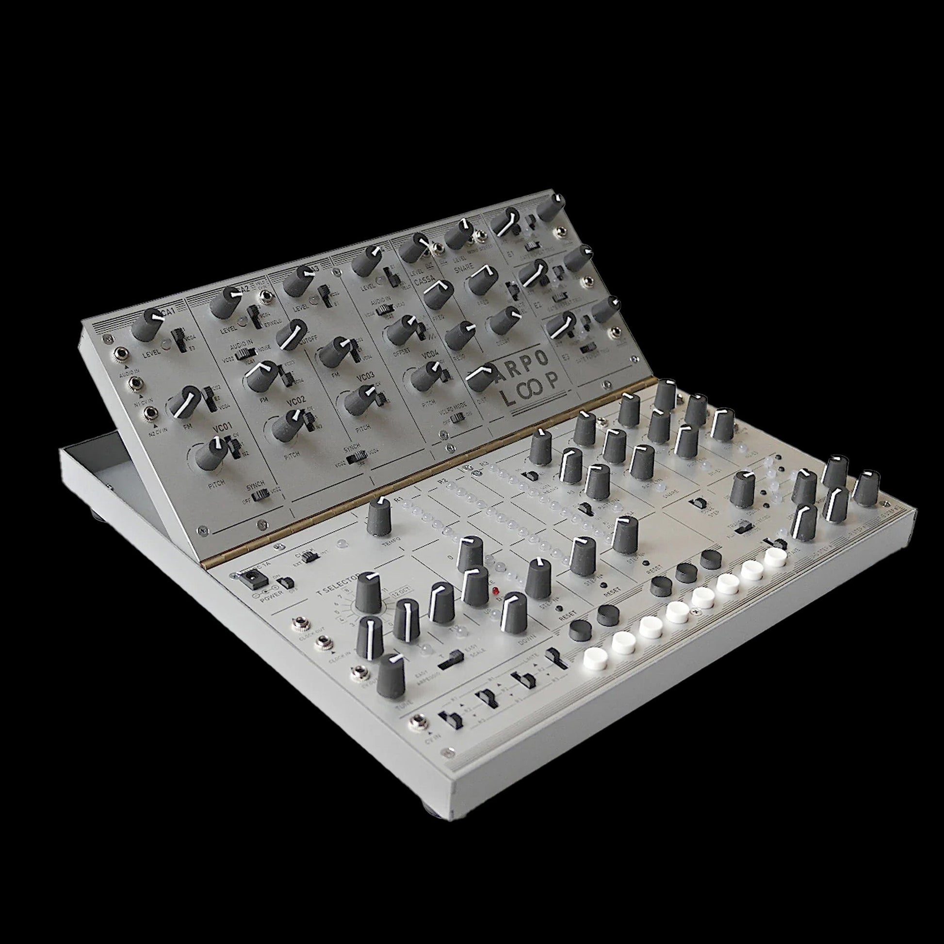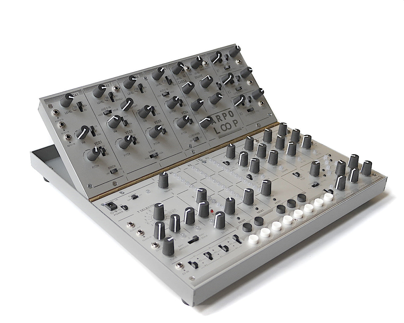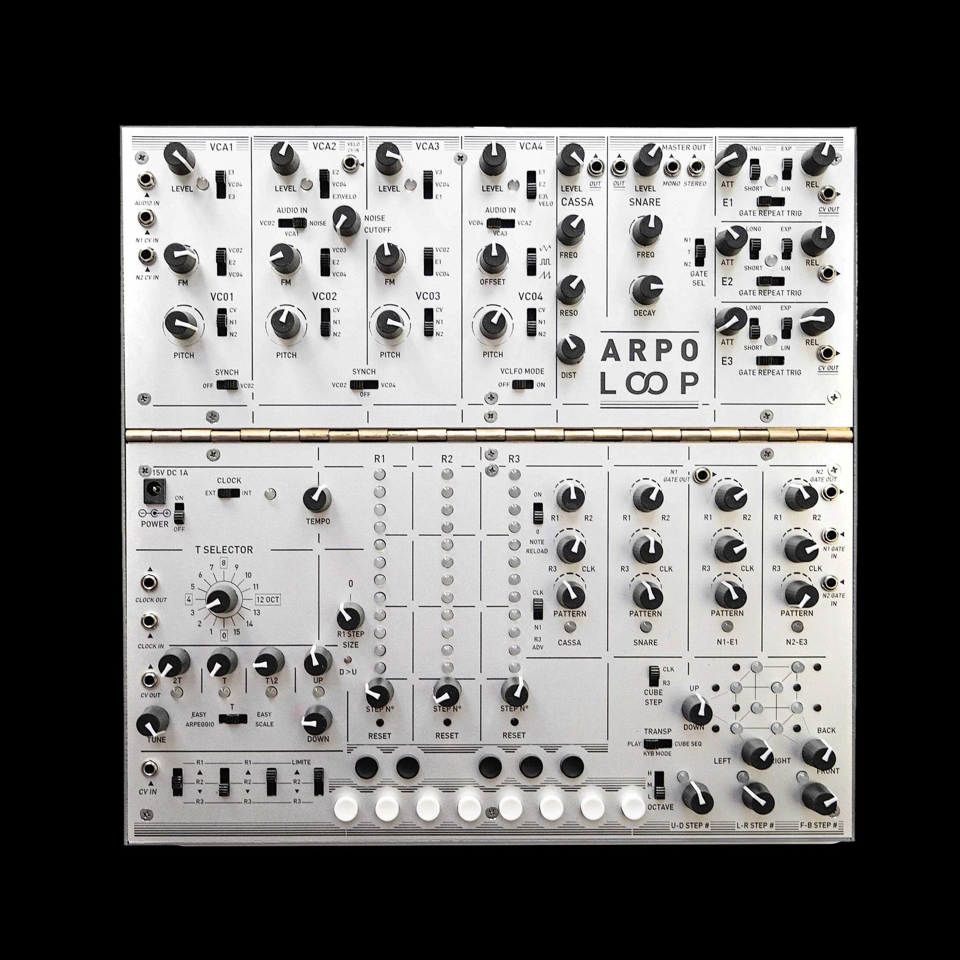 Arpoloop is a full analog synthesizer with a built-in full analog rhythm and melody composer. Since there is no microprocessor nor digital memory it can not be programmed in the usual way instead it can be set and guided to play a line whose parameters are user definable with virtually infinite combinations.