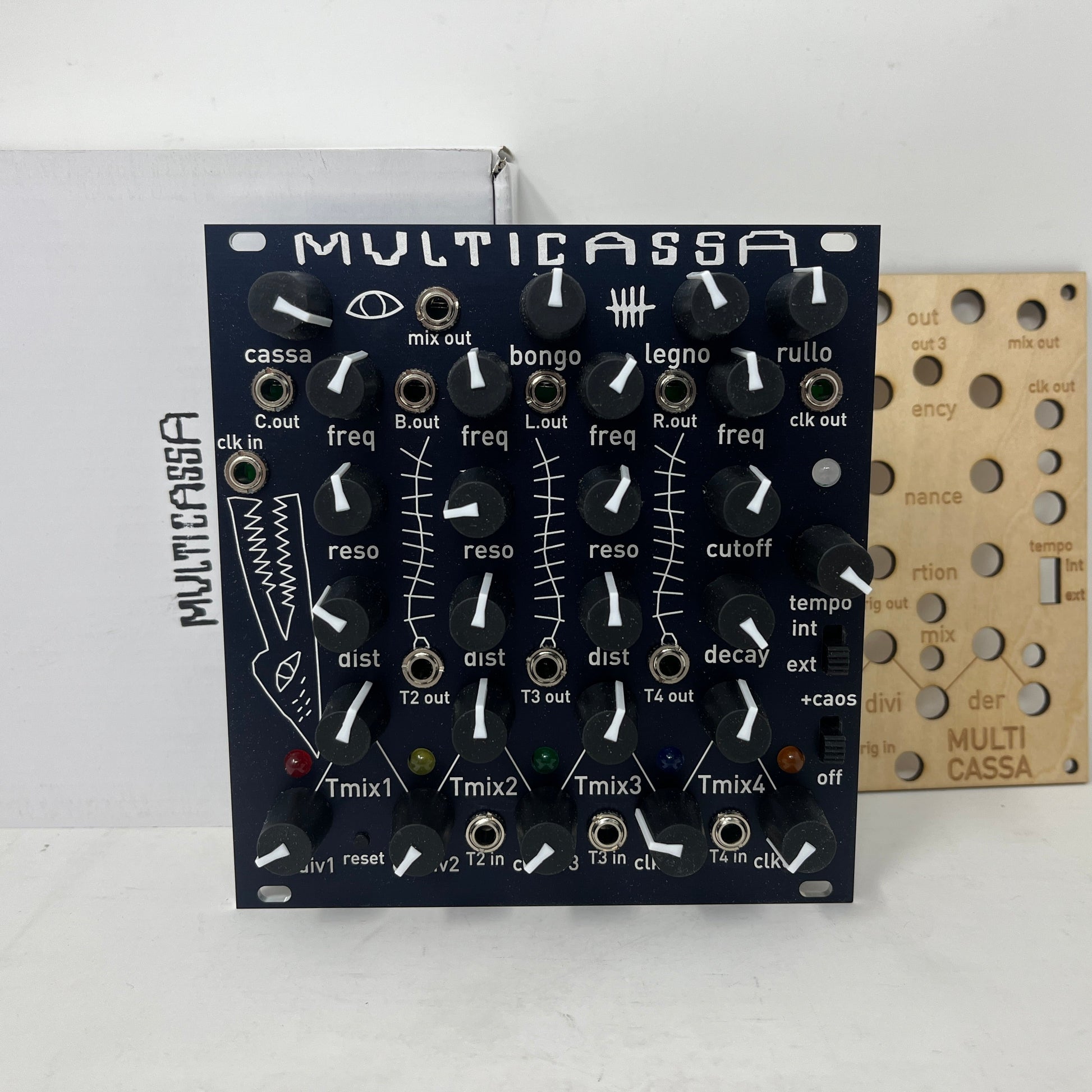 The Multicassa is an electronic instrument composed of three cassa generators controlled by an analog trautonium like rhythm generator.