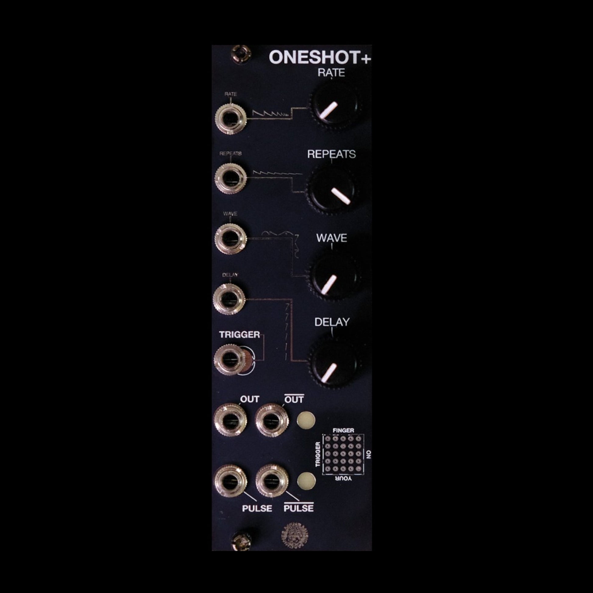 Expanding on the original Oneshot module, Oneshot+ adds full voltage control over every parameter. There is now also an inverted output in addition to the standard non-inverting output. A built in comparator scans the main output and send a gate/pulse signal to the pulse output. This is an excellent source of gate bursts for triggering drums. Finally there is an inverted pulse for further rhythmic exploration. Press the touchpad to manually trigger the Oneshot+