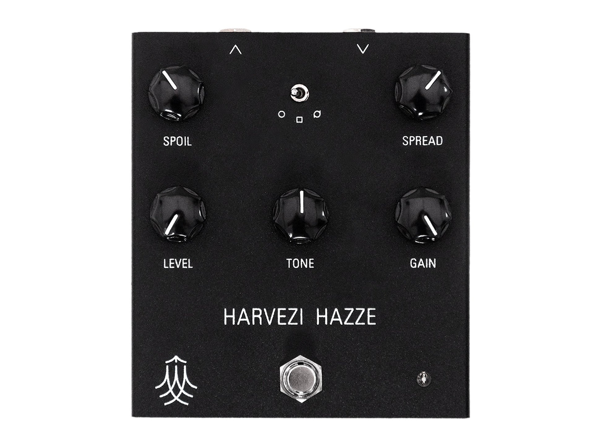 Harvezi Hazze's controls are fairly straightforward, yet through its unique unijunction transistor design offers a distortion effect unlike typical topologies. The Gain control affects the output amplitude within the distorting amp, with a switch to select between soft and aggressive voicings. Spoil and Spread affect the transistor waveshaper, setting a fold threshold with Spoil and a fold amount with Spread. Tone adjusts the brightness of your sound, adding more harmonics at higher settings. When you want to take your tone into uncharted territory, flip the total feedback switch to introduce self-oscillation as Harvezi Hazze's parameters start to chaotically influence one another. On the side of the pedal, switches to engage an additional tone stack or bass boost. Finally, a level control is available for your output volume.