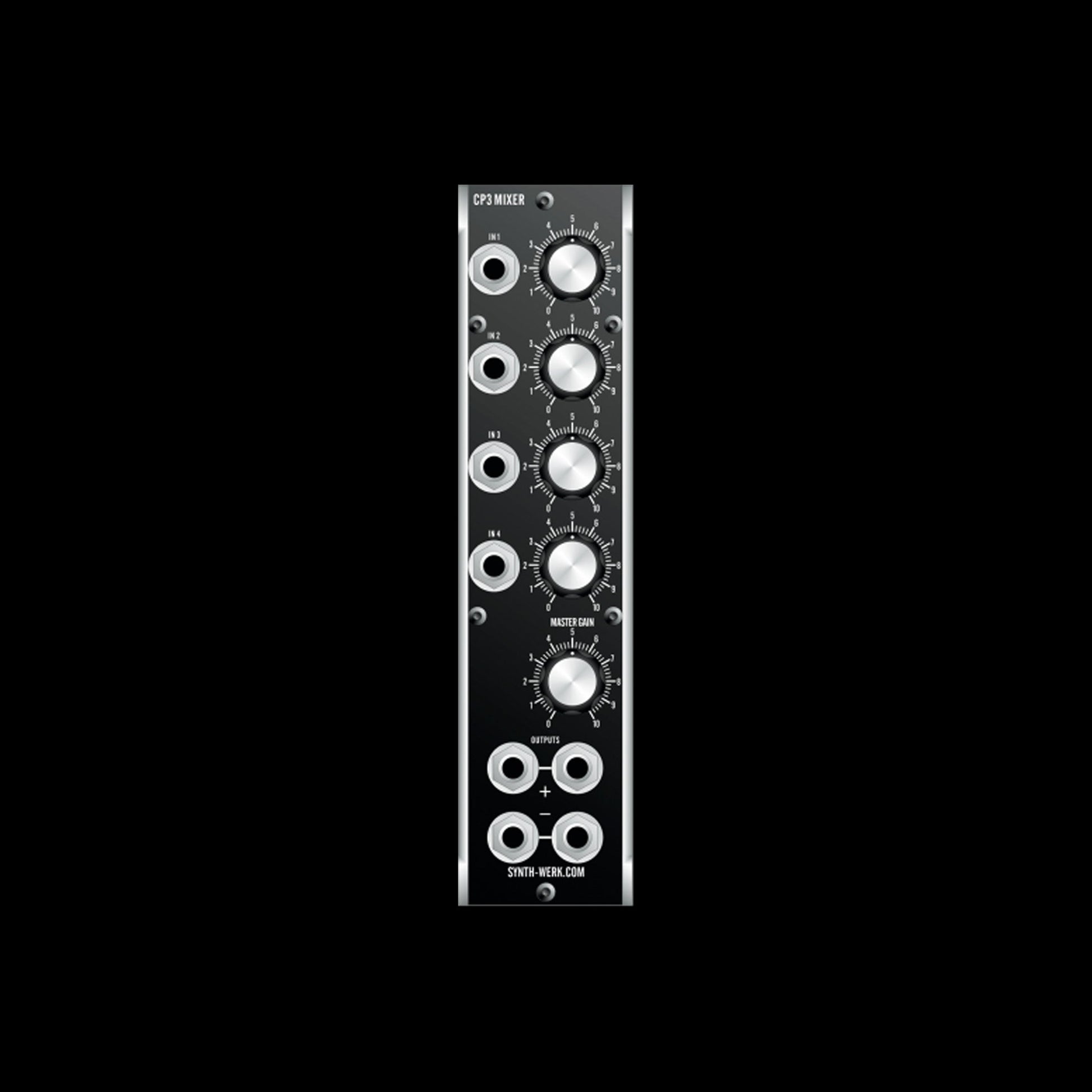 The four channel mixer is useful for combining several signals to form a single output. Audio signals from up to four different sources can be varied in relative volume before processing the mix through filters or amplifiers for a final result. Control voltages can be mixed, attenuated and phase inverted before being introduced into a voltage controlled module. In addition, the CP3 mixer can be used for phase cancellation of complex sounds, e.g. if two or more signals with similar frequency content are combined at opposite phase relationships and for feedback where the output of the mixer is sent directly back to an input of the CP3 mixer.