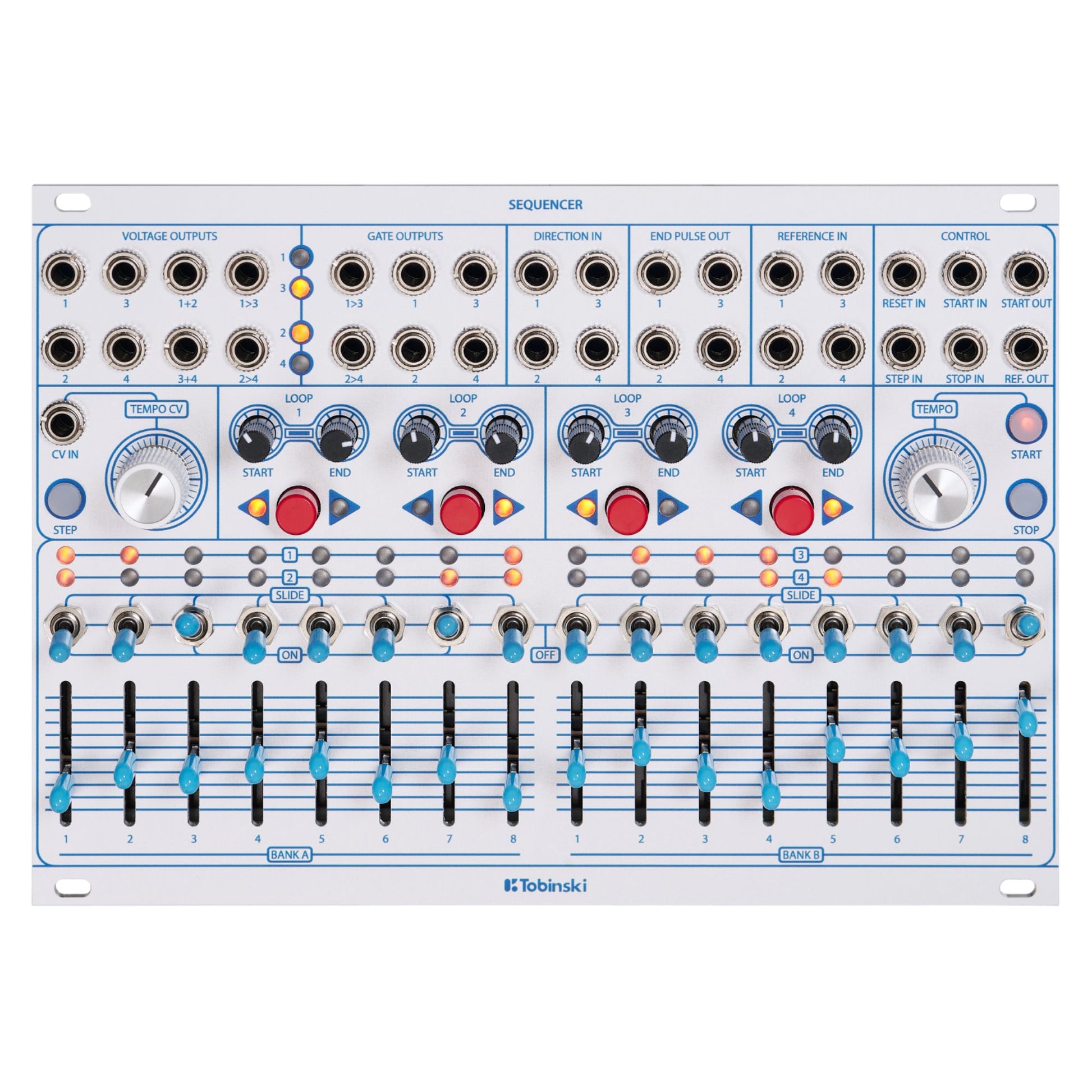 The sequencer features two banks of 8 voltage sliders (plus step On-Off-Slide toggle switches), which are referenced by two 8 step sequencers each.