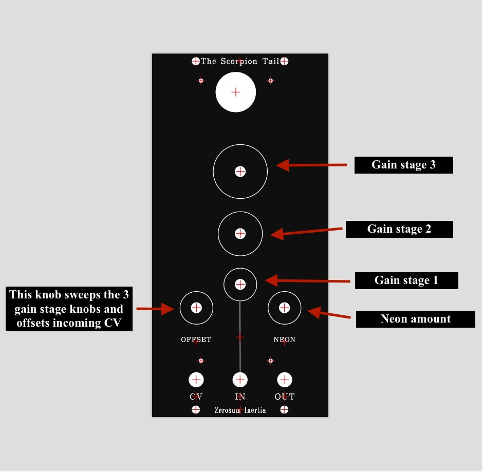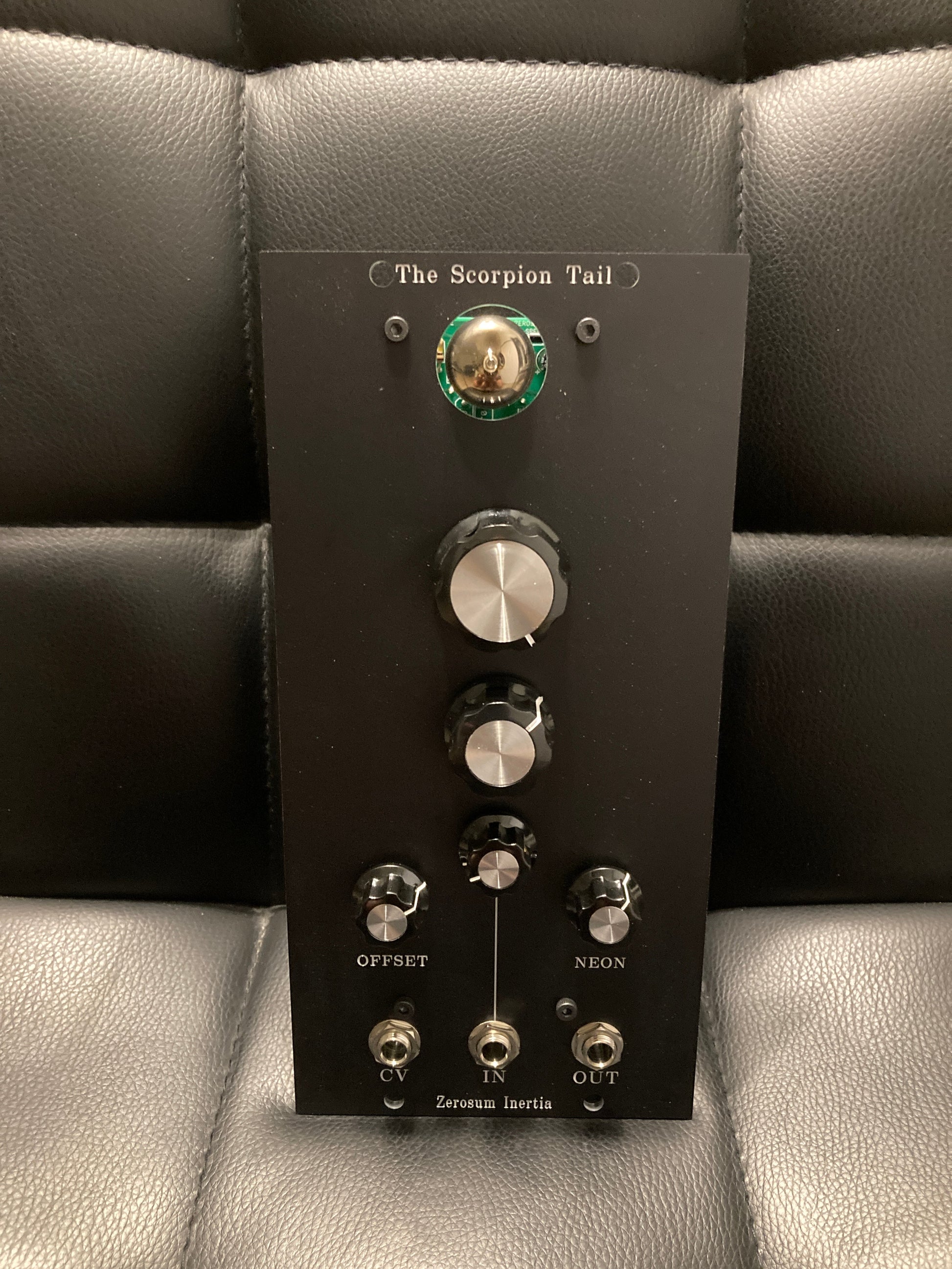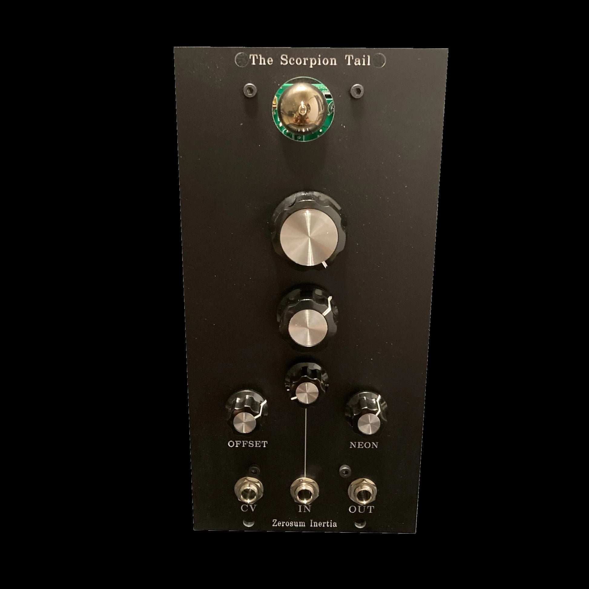The Scorpion Tail 5U synthesizer module for dotcom systems is an audio signal processor designed to amplify, distort and create new waveshapes by processing audio through a 19EZ8 triple triode and A1B neon lamp.