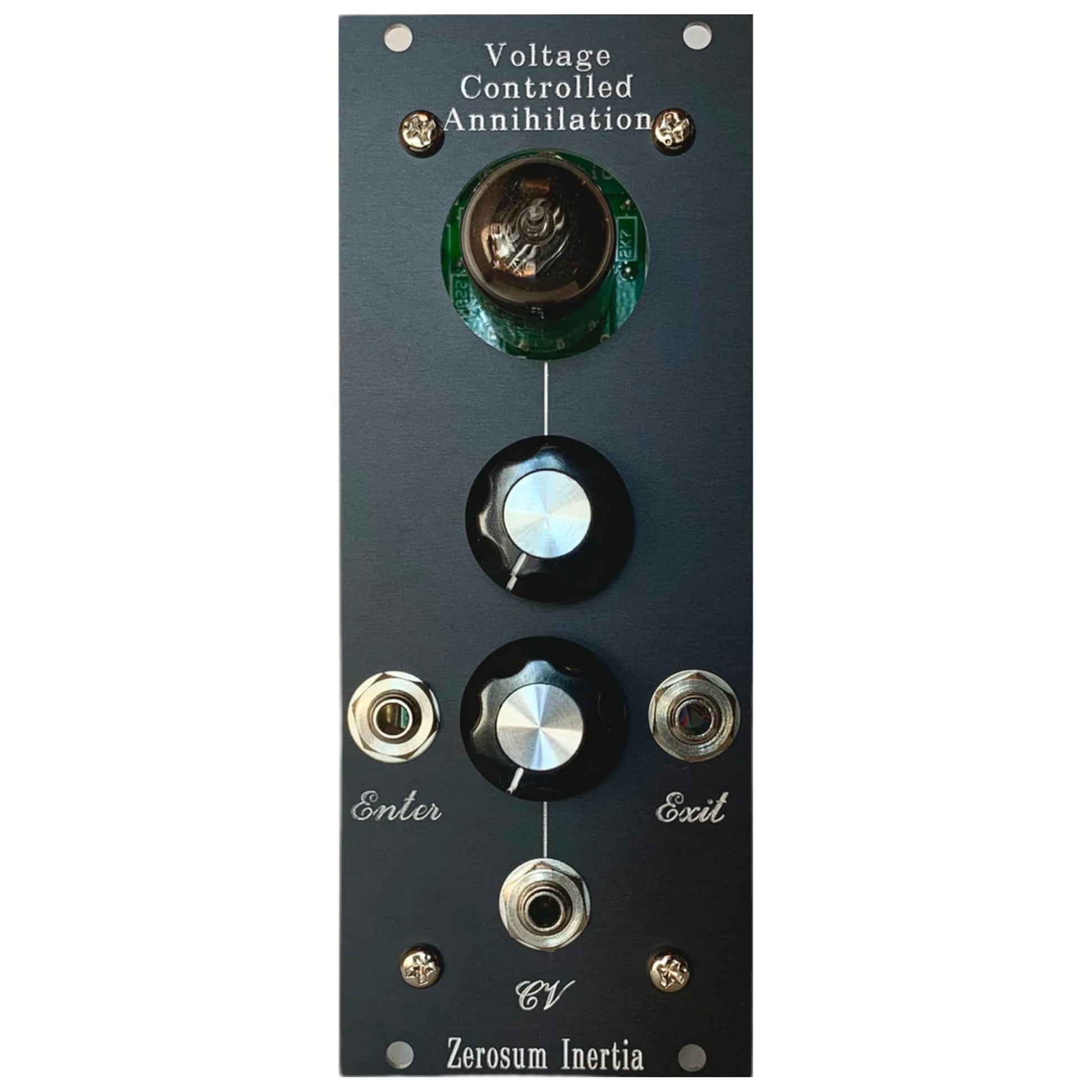 the voltage controlled annihilation module from zerosum inertia is the next level in the universe of audio destruction and madness. a high quality nos 12au6 pentode is selected for it's excellence in audio amplification to drive a neon gas filled lamp. the neon lamp sounds like your speakers are melting and will destroy your audio signal in unique ways when fully cranked up. very crude subharmonic synthesis. when the neon lamp level is backed off a bit, the smooth creamy tube distortion of the 12au6 shines through in a musically pleasant way.